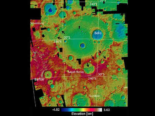 ここでは水星探査衛星メッセンジャー(MESSENGER:MErcury Surface, Space ENvironment, GEochemistry and Ranging)の、2011年3月24日の水星軌道周回開始後のデータを紹介しています。<お断り>: 水星の地名は、画家、小説家、音楽家などの世界中の文化人の名前からとられています。たとえば日本人では、葛飾北斎、丸山応挙、夏目漱石など多数の名前が使われています。人名なので外国人の場合にはどのように読むのか分からないことが多くあります。確認できる限りカナ文字で表記していますが、不能な場合は原文そのままで記載しますのでご了解ください。