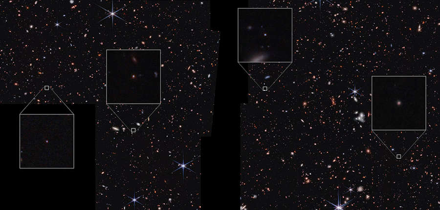 <イメージの説明>: 新たに特定された「カモノハシ」サンプルに含まれる9つの銀河のうちの4つは、NASAのジェームズ・ウェッブ宇宙望遠鏡による宇宙進化早期放出科学調査(CEERS)で発見された。それらを際立たせる重要な特徴の一つは、ウェッブのように細部を捉えられる望遠鏡でも、その尖った形状である。