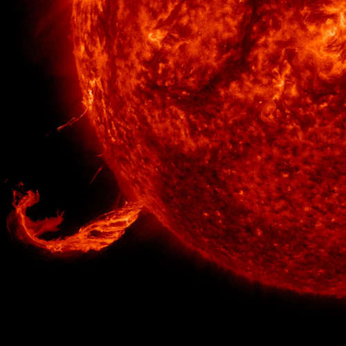 NASAとヨーロッパ宇宙機関の太陽太陽圏観測所(SOHO)宇宙船は、2015年2月24日に、太陽のフィラメントの一部とともにコロナ質量放出した3時間の間に、この太陽の極紫外線波長のイメージを撮った。一部の筋は太陽に落ちたが、かなりの部分は明るい粒子の雲の中で宇宙に飛び出した。 |