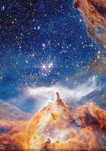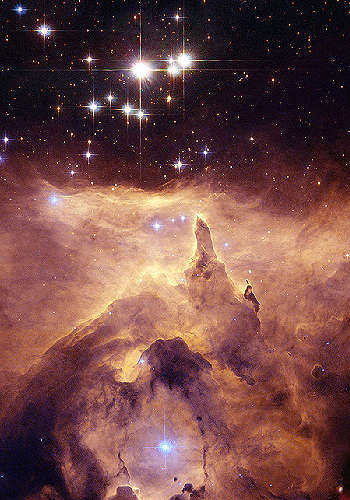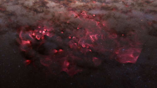 ミルキウェイ銀河の端に向かって、まだ形成中の若い星が、お祝いの花火の形で宇宙に誕生のお告げを送っている。 |