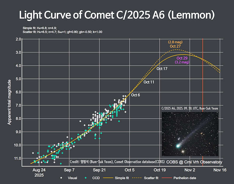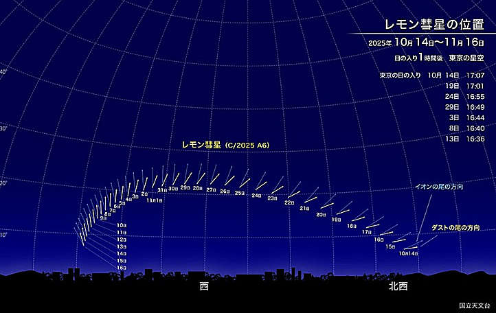 2025年1月に発見された彗星(すいせい)、Lemmon彗星(C/2025 A6:レモン彗星)が、2025年10月から11月にかけて見ごろを迎えます。10月中旬までは明け方の東の空に、10月中旬以降は夕方の西の空に見えます。最も明るくなるのは10月下旬から11月上旬頃と予想され、そのときの明るさはおよそ3等から4等となることが期待されます。3等の明るさの彗星を肉眼で見るのは少々難しいのですが、よく晴れた空が澄んだ日に暗い場所で見た場合には、肉眼でぼんやりとした彗星の姿を観察できる可能性があります。また4等程であったとしても、双眼鏡を使えば観察が可能であると予想されます。 |