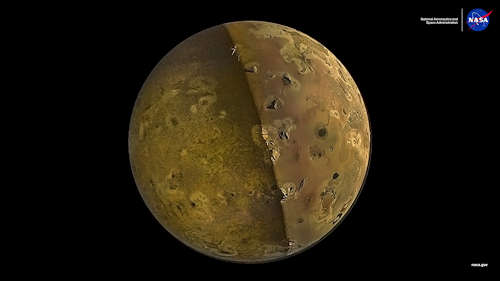2023年12月30日に木星の衛星イオを近距離飛行した際に、NASAのジュノ宇宙船は、イオの火山の表面の、これまでで最も詳細なイメージを撮った。この月の上空約1,500キロメートルからジュノカメラ装置で撮影したこのイメージでは、イオの夜の側(左)が、木星の表面から反射した太陽光「ジュピターシャイン(Jupitershine)」によって照らされている。 |