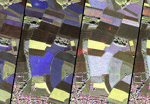 このバイエルン州のプッチ試験地域のレーダー合成は、左から右へ、2025年4月から7月までの、植生の発達を約2週間間隔で示している。 |