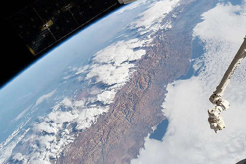 フランス領コルセ(Corse)島、イタリアのサルデーニャ(Sardinia)島、シチリア(Sicily)島を含む街の灯が、軌道上の日の出に向かって飛行する、地中海上空 261 マイルの国際宇宙ステーションから撮られている。前景には、国際宇宙ステーションのカナダ製ロボットアームCandarm2の一部がある。 |