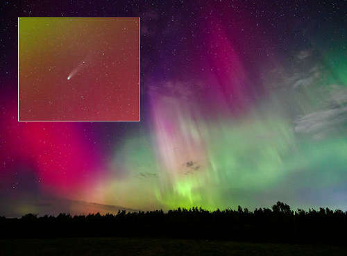 10月17日遅く、遅れたCMEが地球付近を通過した。ニアミスは予期せぬ写真撮影を生み出した。オーロラがレモン彗星を飲み込んだ(C/2025 A6)。 |
