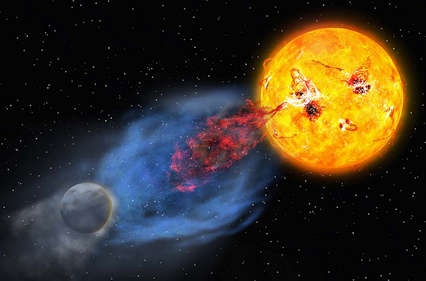 <イメージの説明>: りゅう座EK星のフレアに伴うガス噴出の想像図。高温で速い噴出が青く、低温でゆっくりした噴出が赤く描かれている。 |