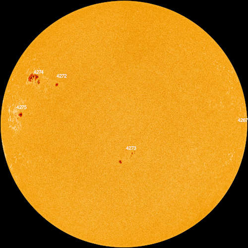 今日、太陽は、 コロナ質量放出(CME) を地球に向かって投げつけたが、これは直撃になるようである。黒点4274(左図の左上)からのM7.5級の爆発には、明確な地球指向の要素がある。合計で、今後数日間に3つのCMEが地球に衝突する。その結果、11月6日から8日にかけて、強いG3クラスの地磁気の嵐が発生する可能性がある。 |