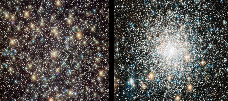 国際的な調査チームは、ミルキウェイ銀河の48個の球状星団の紫外線のハッブル観測を分析し、これまでに作成された最大かつ最も完全な青いはぐれ者の星のカタログを作成した。このサンプルには、星の密度の全ての範囲にわたって星団に観測された3000以上の謎めいた天体が含まれており、天文学者達は、青い星とその周囲との、長い間疑われていた関連性を探すことに役立てている。 このイメージには、データセットの中でも比較的緩やかな集団の一つであるNGC 3201(左)と、調査での最も密度の高い集団であるメシエ70が写っている。 <イメージの説明>: 2つの球状星団、NGC 3201(左)とメシエ70(右)の並べた視界。右側の星団は天体の中心近くの星が非常に近くに見えるために、明らかにコンパクトな形状をしている。対照的に、左側の星団は密度が低く、星同士が視野の中でより離れて散らばっている。