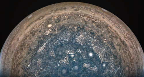 このイメージはNASAのジュノ宇宙船によって 52,000 キロメートルの高度から見られた木星の南極を示している。卵形の地形は直径 1,000 キロメートル以下の台風である。昼光、拡張された色、立体画法の投影で全エリアを示すために、3回の別々の軌道で JunoCam 装置でとられた複数のイメージが結合された。