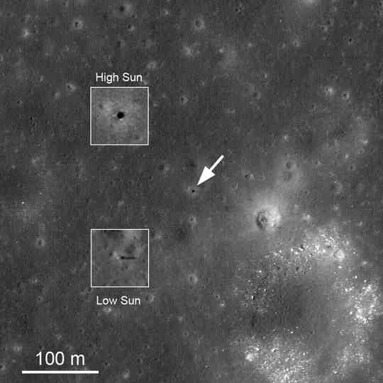 | サーベイヤ1号は二つの非常に異なる照明の下で「月偵察軌道船カメラ」によって描かれた。背景のイメージは地平線の上太陽が67度で獲得された。サーベイヤは矢印で示され上の差し込みに拡大されている。下の差し込みは地平線からの太陽が14度で描かれた同じサーベイヤを示す。 |