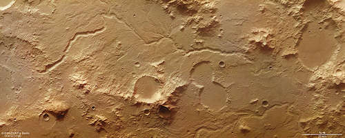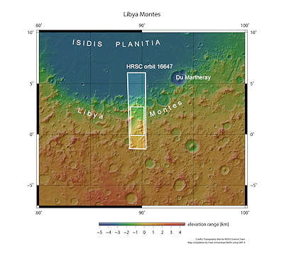 南の高地と北の低地の境界の赤道に位置するリビア山塊(Libya Montes)領域のこの部分は、2017年2月21日に宇宙船の高解像度ステレオカメラで撮られた。火星で最も古い領域の一つ、リビア山塊のハイランドは、図の北に見られる約39億年以前の幅 1200 キロメートルのイシディス・インパクト盆地の形成の間に隆起した。この広い領域全体に見られる地形は、火星の初期の歴史に存在した湖または海のような流れる川と水を示している。南から北へ走る顕著な川のチャネルは、およそ36億年前にこの領域を通して左から右へ切ったと考えられる。それは明らかに南のインパクトクレータから始まり、クレータ壁を破って北に向かって流れ、この地の地形の凹凸の山脈に結ばれている。