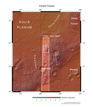 ヨーロッパ宇宙機関のマーズエクスプレスの高解像度ステレオカメラで4月9日にとられたこのイメージは、南からの巨大なソリス平原火山地帯(Solis Planum volcanic plateau)の外辺のサウマシア(Thaumasia)山脈とコラキス(Coracis)地溝帯を示している。この領域は、広大なマリネリス峡谷システムと、そびえ立つタルシス火山達との南に横たわり、35億年以上前の形成の間の地殻構造上のストレスに強くリンクしている。この惑星の最初の10億年の間にタルシスの隆起がマグマで膨張したとき、この周囲の地殻は引き伸ばされ、引き裂かれ、最終的にトラフの中に崩れた。マリネリス峡谷は最も極端な結果の一つであるが、その影響は、このイメージに見られるコラキス地溝帯領域のように数千キロメートル離れてさえもまだ見られ、そこでは、ほぼ平行な南北の断層が左に見られる。