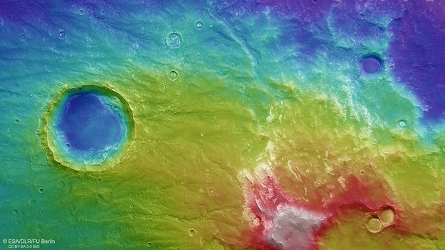 氷の豊かな地表をたたいたインパクターが、この火星の古代のクレータの周りに複雑な流れの形をつくり出した。彗星や小惑星のインパクトは、太陽系の46億年の歴史で岩の惑星と月の表面を形づくり、その形成時の環境条件を明らかにする。