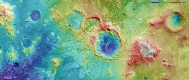 このカラーイメージの右の部分と大きなクレータの縁で、水の存在によって形成される粘土鉱物かもしれない明るい色の堆積が目立っている。類似した堆積が近くのランプランド(Lampland)クレータに確認された。また、活動的な地殻構造がこの光景を形づくったときに同時に起きた、地下水の浸食と地表の流れによる谷の形成の証拠がある。この図をベースとした浸食はこのトラフが部分的に埋められ激しく変形したことを意味する。この領域は後に氷河のプロセスによって変形され、大きなクレータの平らなフロアに流れのような線形のパターンが見られる。この領域は、火星の古代の高地の典型として、赤い惑星の地質の歴史に関する豊かな情報を保っている。