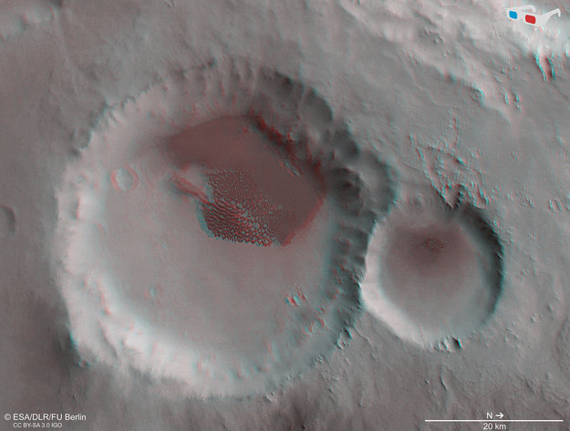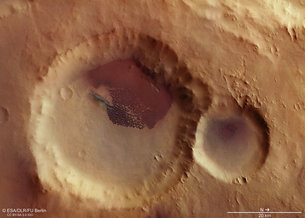 ヨーロッパ宇宙機関のマーズエクスプレスによって5月16日に撮られた火星のクレータ・フロアに見られるように、砂丘は支配的な風の際立った指標である。