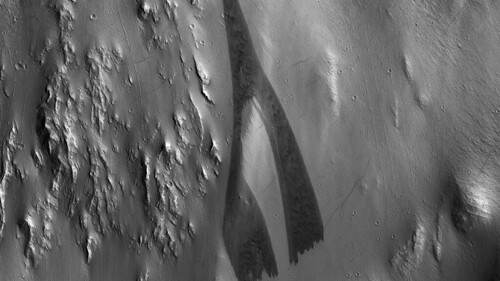 紫がかった鱗のような波が、ラテン語で「セイレーンの海」を意味する火星のテラ・シレナム(Terra Sirenum:シレナム大地)の上空を飛ぶヨーロッパの宇宙船の注目を集める。