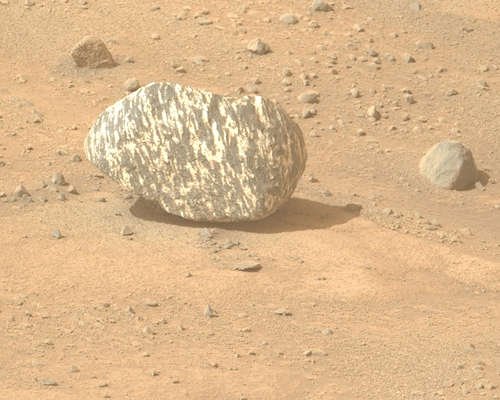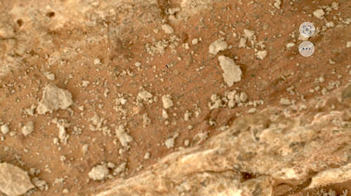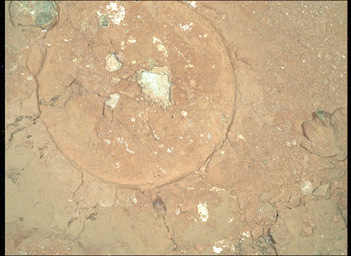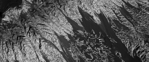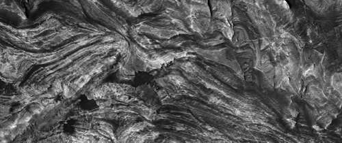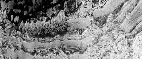 イメージの左側は、氷の層が凍結し、その中にさまざまな量のダストが閉じ込められたときに形成された、露出した層状の堆積物の厚いスタックによって支配されている。イメージの右側は、これらの極の層の堆積物の滑らかな表面を示している。