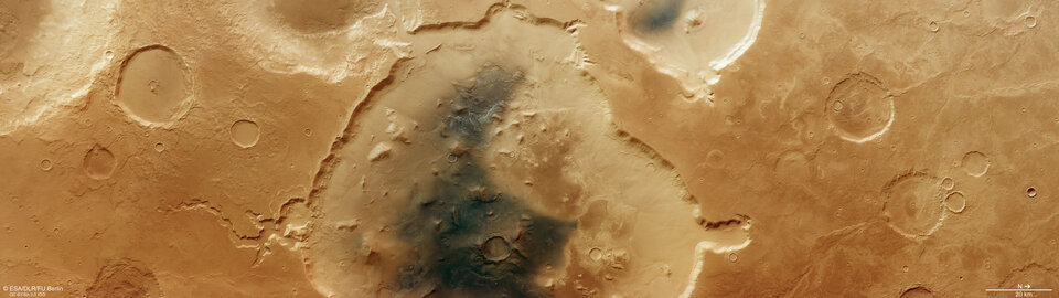 2024年10月にマーズ・エクスプレスの高解像度ステレオカメラ(HRSC)が撮影したこの新しいイメージは、地球の険しい南部の高地と滑らかな北部の低地との間の移行帯に位置する幅約120kmの窪地、デュテロニルス・カヴスを示している。