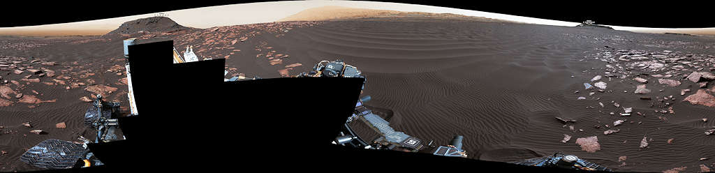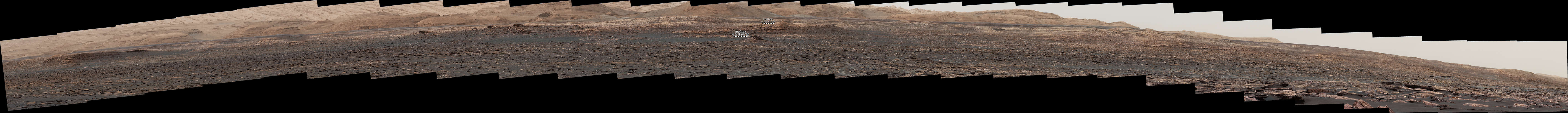 暗い火星の砂の波紋の線形砂丘、「ネーサン・ブリッジの砂丘(Nathan Bridges Dune)」が、このNASAのキュリオシティローバーのマストカメラ(Mastcam)からの全周のパノラマを支配している。この砂丘は、活動的な火星の砂丘を調査する、ローバー・ミッションのキャンペーンの調査地点の一つであった。この地形は、キュリオシティ・チームの砂丘キャンペーンのリーダーであった惑星科学者ネーサン・ブリッジ(1966-2017年)を記念して、2017年に非公式に名付けられた。この光景は、2017年2月5日の火星日 1,601 日に、 Mastcam の左のアイカメラでとられた112のイメージを結合している。中央は東南東に向かい、両端は西北西に向かっている。左半分の地平線の暗いビュートは、「イレソン(Ireson)ヒル」である。上のシャープ山は地平線上の中央にある。左のスケール・バーはビュートの最も上を示しカメラから約42メートルを、その下に、カメラから約25メートルの露岩の地形を示している。右のスケールの情報は、550メートルの距離にある約3分の一のメサの地形を示している。