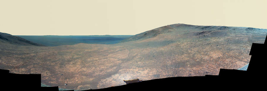 NASAの火星探査ローバーオポチュニティのパノラマカメラ(Pancam)からのこの光景は、エンデバークレータのフロアを見渡す「スピリッツマウンド(Spirit Mound)」を示している。このマウンドは、クレータの西の縁の「ビタールート(Bitterroot)谷」の東端近くにあり、東の方向に向かっている。スケールの参考として、中央下の2個の岩はそれぞれ差渡し約20センチメートルである。マウンドの頂上ラインのイメージは幅約 8.5 メートルのエリアをカバーしている。この合成のための構成要素イメージは火星日 4,501 日(2016年9月21日)にとられた。各露出は、 753 ナノメートル(近赤外線)、 535 ナノメートル(緑)、 432 ナノメートル(紫)の、パノラマカメラの三つのカラーフィルタを通してとられた。この光景はほぼ真の色で示されている。ローバーの科学チームがこの地形のために選んだ非公式の名前はサウスダコタのスピリッツマウンドを指している。チームは、ルイスとクラーク遠征(Lewis and Clark Expedition)によって訪問された、その遠征がモンタナを訪ねた谷にちなんで、非公式の名前として火星のビタールート谷の名前を使っている。