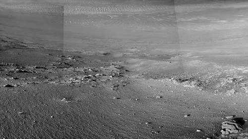 イメージ: 「忍耐の谷(Perseverance Valley)」のこの地上の一部の模様は、この丘の下り坂に見える場面の構成要素イメージをとるためにそのナビゲーション・カメラを使ったNASAの火星探査ローバー・オポチュニティによって調査中である。