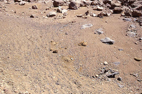 このイメージは、ハワイのマウナケアの火山丘(volcanic cone)の側面の石のストライプを示している。これらのストライプは小さな岩の破片から成り下り方向に並んでいる。