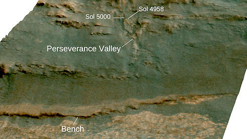 イメージ:この透視図の中で火星の斜面を下っているチャンネルは、NASAのマーズローバー・オポチュニティの第 5,000 火星日を通して調査しているエリア「忍耐の谷(Perseverance Valley)」である。この視界は、形を示すために地形モデルの垂直5倍に誇張した HiRISE イメージに重ねられている。