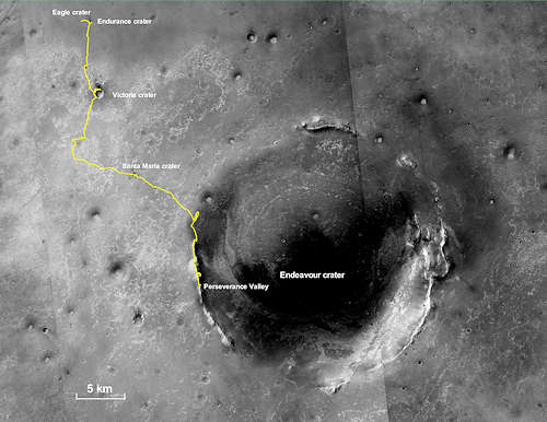 このNASAのオポチュニティ・ローバーの最終的な横断マップは、エンジニアリング・チームがロバーとと最後に接触した日付、2018年6月10日のローバーの位置、忍耐の谷までを示している。このマップに見えるのは、オポチュニティの着陸地点(イーグルクレータ)に始まり、その最終的な静止場所、エンデバー・クレータの縁までの 45.16 キロメートルの黄色の横断ルートである。ダストの嵐によってそのミッションを終えたとき、ローバーは、クレータの中の忍耐の谷(Perseverance Valley)に下っていた。このマップは、NASAの火星偵察軌道船(MRO)のコンテキスト(概況)カメラでとられたいくつかのイメージからつくられている。