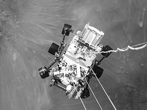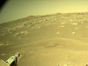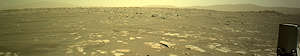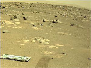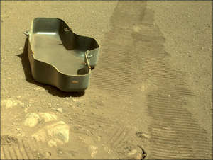 2021年2月18日に火星に降下したときの着陸用防護シェル、マーズ2020宇宙船の熱遮蔽が落ちている。シールドの上に見えるオレンジのケーブルは、火星への将来の宇宙船の着陸の際に技術者達に資するであろう、 MEDLI2 と呼ばれるセンサーと電子部品の一部である。