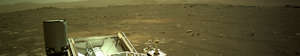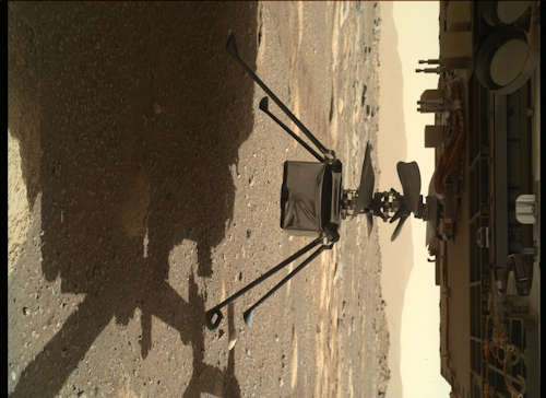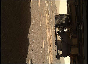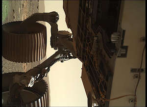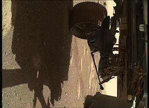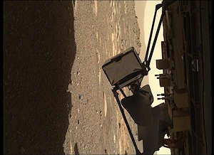 NASAのインジェニュイティヘリコプターは、火星日39日、2021年3月30日に、パーサービアランスローバーの腹から降ろされ展開されるその足の全4本とともにここに見ることができる。このイメージは、ローバーの長いロボットアームの終端の、 SHERLOC 装置のワトソンカメラでとられた。