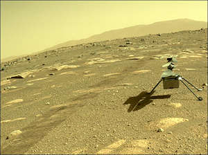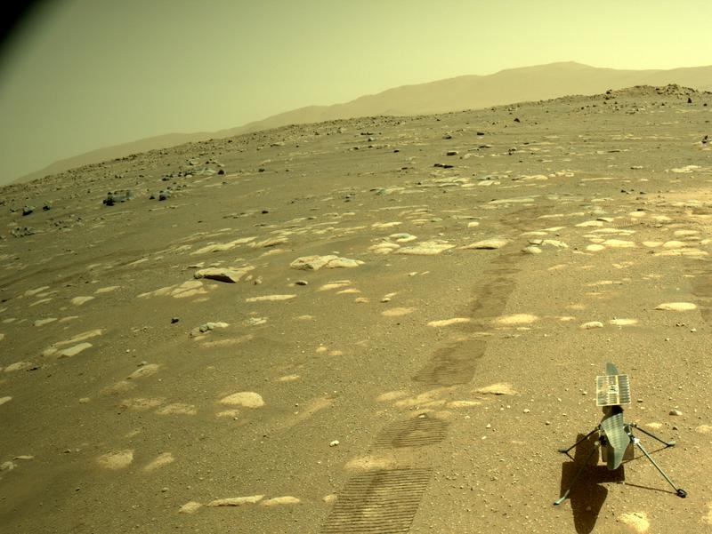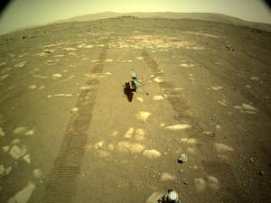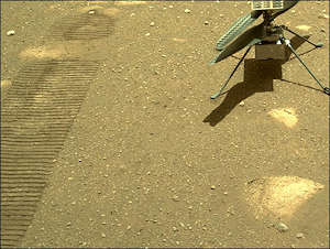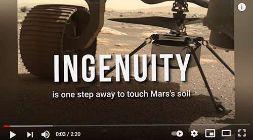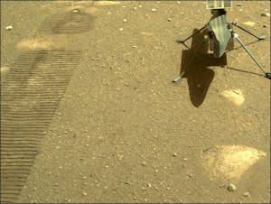 火星日36日目の2021年3月26日、伸ばされた4本の足の二つとともに、インジェニュイティマーズヘリコプターが降ろされる。これらのイメージは、ローバーの長いロボットアームの終端にある SHERLOC(Scanning Habitable Environments with Raman and Luminescence for Organics and Chemicals) 装置の WATSON(Wide Angle Topographic Sensor for Operations and eNgineering) カメラでとられた。