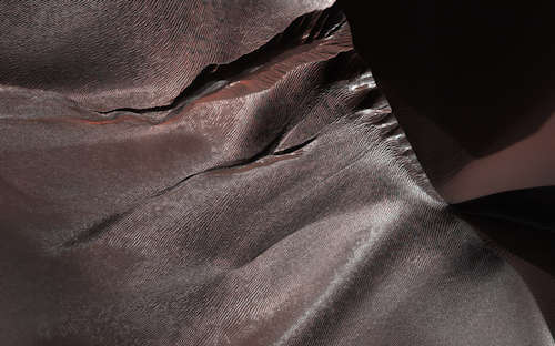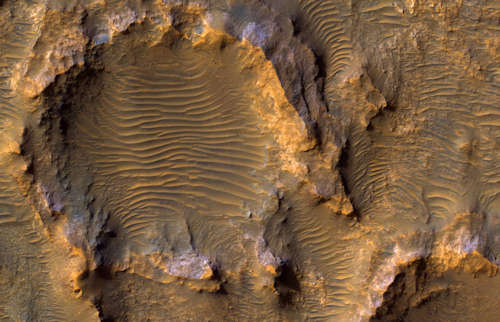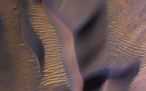 火星のワーツ・クレータ(Wirtz Crater)において、これらの砂丘は、風による砂の動きによって形成され変化してきた、風上の斜面の波紋と風下の斜面の暗い筋によって恐らく活動的である。砂丘に焦点を当てるために色が強調されている。この動きは、二つの斜面の間の端、砂丘の淵と下端を鋭く保つだろう。砂丘の斜面の暗い線と短い不規則な曲線はダストデビルの通過によってつくられた。