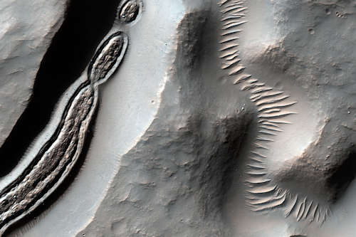 NASAの火星偵察軌道船からのこのイメージは、窪地に流れ込むチャンネルに沿ったトラフのクローズアップである。いくつかの HiRISE イメージは、奇妙に見える構成を示している。概観カメライメージを見ることによって、ある時はその場面の状況を理解するのを助ける。ここでは、中央峰を持つインパクトクレータ、また、ピークの北の同心のトラフを持つ崩れた窪地を示している。トラフのフロアには、我々が概して氷河の流れがあった中緯度領域に見るいくつかの彫られた素材がある。同心のトラフを持つこれらの窪地は火星のそこここに存在し、それらの起源は議論の種として残されている。このマップはピクセルあたり50センチメートルのスケールで投影されており、北は上である。
