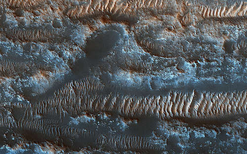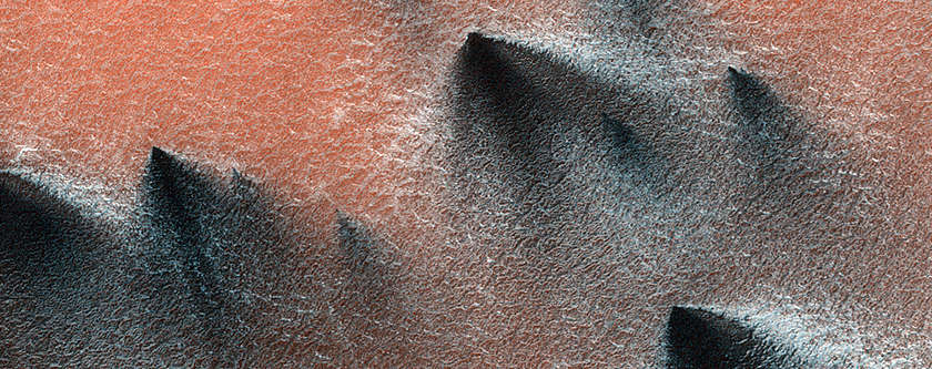 NASAの火星偵察軌道船がこのイメージを得た火星の夏の初めには、砂丘は季節の氷でほとんど覆われていなかった。一日のほとんどが陰になる氷のポケットのみが保護されて残っている。火星の北極は砂丘の広大な海に囲まれている。この砂丘フィールドでは、砂丘は、冬にはドライアイスの季節のキャップで覆われる。