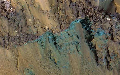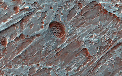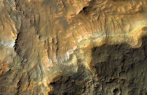 NASAの火星偵察軌道船(MRO)からこのカラーイメージは多様な色と組成の基盤の層を示している。