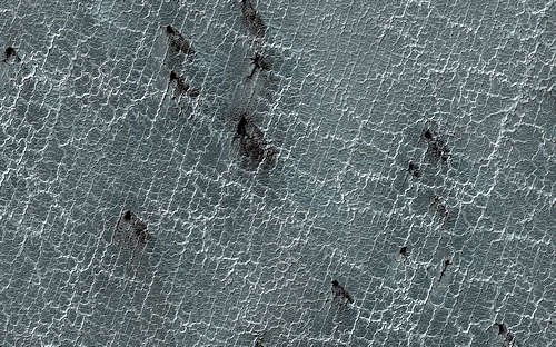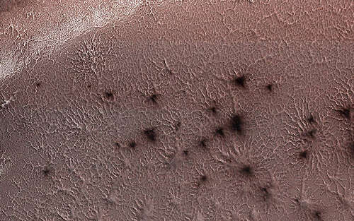 火星の南極の冬の間の2018年5月13日に得られたNASAの火星偵察軌道船(MRO)からのこのイメージは、この領域を覆っている二酸化炭素の氷冠と、太陽が春に戻り、いわゆる「蜘蛛」が出始める光景を示している。これは地球では見られない活動的な季節のプロセスである。地球のドライアイスのように、火星の二酸化炭素の氷は暖かくなるにつれて昇華し、固体から直接気体になり、そのガスは地下に捕らえられる。捕らえられた二酸化炭素のガスは、時がたつにつれて圧力を増し、最終的には氷を突き破る十分な強さになる。これらのガスが大気に開放され、暗いダストが排気口の周辺に堆積し、あるいは、風によって筋をつくるように運ばれるだろう。この昇華する二酸化炭素の消失が、これらの蜘蛛の巣のような地形を残す。