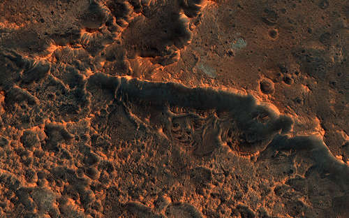 このイメージは「地形の逆転(topographic inversion)」と呼ばれる興味ある現象を実証している。この写真の南半分は、よく保存された溶岩流によって覆われている。この流れは急峻な斜面を下る淵で止まっている。溶岩は落下の恐れがない。何がここに起きたのだろう? それは、恐らく、かつて北の台地が高く、溶岩がそれ以上に流れるのを止めたからである。溶岩が冷えたときその下の地面を保護したが、北のより柔らかい岩が浸食し続ける間、地形が「逆転」し、それによって、かつて低地だった地面が、今、メサの頂上である。このマップはピクセルあたり50センチメートルのスケールで投影されており、北は上である。