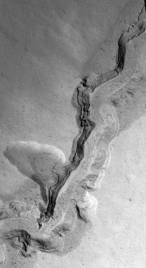 「火星谷(Kasei Valles)」と呼ばれる火星の領域で、小さなチャンネルが、洪水で掘られたチャンネルの巨大な780キロメートル長のフロアを切っている。