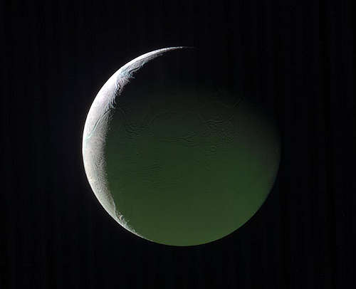 三日月形のエンケラドゥスの明るく陽に照らされた輪郭が宇宙の黒さに対して薄く見えている。土星から反射される光によって照らされた残りの月は幽霊のような外見を示している。差渡し504キロメートルのエンケラドゥスは、薄い三日月によって明らかなように、このイメージでは背景の光で照らされている。しかしながら、太陽-エンケラドゥス-宇宙船の角度は141度であり、この月の有名な噴煙を見るには低すぎる。この視界はエンケラドゥスの土星に面する半球を見ている。エンケラドゥスの北は上である。このイメージは、エンケラドゥスから約 180,000 キロメートル離れたところから、カッシーニ宇宙船の狭角カメラで、2017年3月29日に、赤外線(930nm)、緑、紫外線(338nm)フィルタを使ってとられたイメージの合成である。イメージスケールはピクセル当たり1キロメートルである。