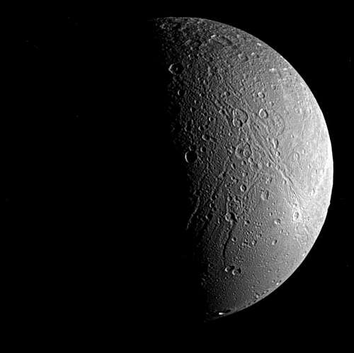 NASAのカッシーニ宇宙船から、半分が影、半分が明るい土星の月ディオネが捕えられている。曲がりくねった峡谷が、月の氷の光景全体に相互に連結した経路を刻んでいる。明るさにおける微妙な変化が、ディオネの地表の素材または表土の粒の大きさや形とともに、組成の相違をほのめかしている。カッシーニは、これらの月がどのようにでき進化したか、またそれらがどのように結びついているにかを理解するための要求の一部として、差渡し 1,123 キロメートルのディオネとこの惑星の多くの他の月を調査して土星で10年以上を過ごしてきた。この視界は土星から反対方向のディオネの側面を見ている。北は右上59度である。このイメージは、カッシーニ宇宙船の狭角カメラの可視光線で、2017年6月22日にとられた。この視界はディオネから約 360,000 キロメートル離れてとられた。イメージスケールはピクセル当たり 2.2 キロメートルである。
