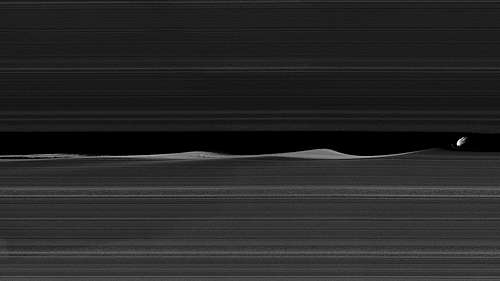 土星の小さなリングに組み込まれた月の一つダフニスが、氷のリングの粒の列の間のギャップの中を周って波を起こしている。このイメージは、最近土星システムでの信じ難い13年の冒険の旅を終えた、国際的なカッシーニ・ミッションによってとられた。2017年2月に初めて公開されたこのようなイメージは、リングの粒の間の相互作用とともに、月と惑星のリングの間の複雑な相互作用のクローズアップの視界を科学者達に提供している。ダフニスは差渡し8キロメートルであるが、その重力は、キーラー・ギャップと呼ばれるリングのギャップの端をマークする、Aリングの小さい粒を崩壊させるのに十分な強さがある。この月がキーラー・ギャップ中を動くとき、波状の形が水平と垂直の面につくられる。月の通過に続く小さなサイズの三つの波頭がここに見られる。頂上の中のリングの粒が互いと衝突して、それぞれ以降の頂上では波の形が変化する。この小さな月に向かって拡大して見ると、ダフニスによって、ほとんどAリングから直接裂かれたように見えるリングの素材の幽かな薄いストランド(撚り糸)を明らかにしている。このイメージは、ダフニスから約 28,000 キロメートルの距離で、カッシーニの狭角カメラの可視光線でとられた。イメージスケールはピクセル当たり168メートルである。