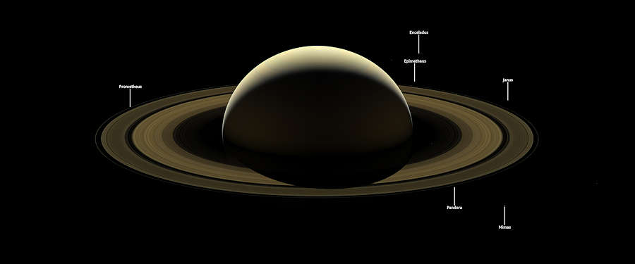 このイメージでは、土星の月の六つ、エンケラドゥス、エピメテウス、ヤヌス、ミマス、パンドラ、プロメテウスが微かな外見をつくっている(多数の星が背景に見える)。合成のこのバージョンは、惑星とそのリングを明るくし、かすかな領域を更に大きく明るくして提供されている(ここでは月と星達は15倍明るくされている)。氷で覆われた月エンケラドゥスが1時の位置に見ることができる。エンケラドゥスの直接下の、このイメージに見られる惑星から一番遠いリング、薄いFリングの外に小さなエピメテウスが横たわっている。Fリングに続いてエピメテウスから時計回りに見られる次の月はヤヌスである。約 4:30 の位置、Fリングの外にあるのはミマスである。ミマスの内側の 4:30 の位置にあるのはFリングを崩壊させている月パンドラである。Fリングの中の10時位置で動き回っているのは月プロメテウスである。