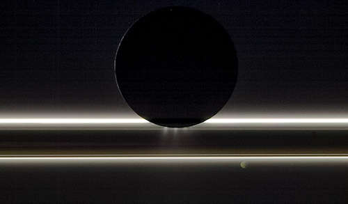 土星の月エンケラドゥスの輝く球に背景を提供して、土星のリングがこの惑星の雲のトップに影を投げている。 この小さな世界の明るく白い表面は、エンケラドゥスの南極の氷の粒のそびえ立つ噴煙から始まる素材の雪から生じている。このイメージは差渡し504キロメートルのエンケラドゥスの軌道進行方向の側を見ている。北は上である。このイメージは、カッシーニ宇宙船の狭角カメラの可視光線で、2007年6月28日にとられた。この視界はエンケラドゥスから約 281,000 キロメートル離れたところでとられた。イメージスケールはピクセル当たり約2キロメートルである。