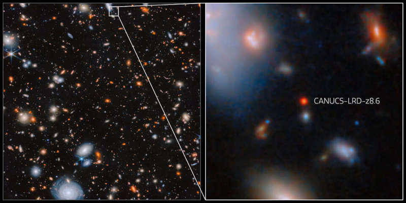 NASA、ヨーロッパ宇宙機関、カナダ宇宙機関のジェームズ・ウェッブ宇宙望遠鏡を用いる研究者達は、ビッグバンからわずか5億7千万年後の銀河内で、活発に成長する超大質量ブラックホールを確認した。CANUCS-LRD-z8.6は、天文学者達を困惑させてきた非常に遠い小銀河のクラスの一部であり、このパズルの重要な一角を示し、初期宇宙における銀河やブラックホールの形成に関する既存の理論に挑戦している。この発見は、初期のブラックホールと現在観測されている光のクエーサーを結びつけている。