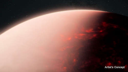 このアーティストのコンセプトは、系外惑星TOI-561 bの広大なマグマの海の上の厚い大気がどのようなものかを示している。NASAのジェームズ・ウェッブ宇宙望遠鏡が惑星の昼間から捉えた光の測定によれば、TOI-561 bは恒星からの強い放射を受けているにもかかわらず、単なる裸の岩ではないことが示唆されている。
