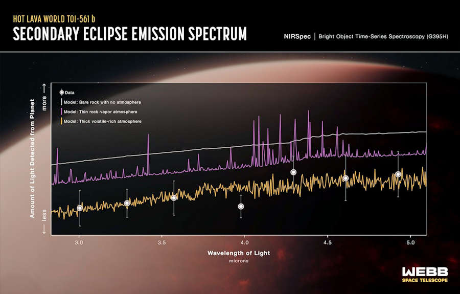 2024年5月にNASAのジェームズ・ウェッブ宇宙望遠鏡のNIRSpec(近赤外分光器)によって捕らえられた発光スペクトルは、超高温の超地球系外惑星TOI-561 bからの3〜5ミクロンの異なる波長の光の明るさを示している。理論モデルとの比較によると、この惑星は裸の岩ではなく、揮発性に富んだ大気に囲まれていることが示唆されている。