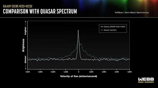 ヤンは、典型的なクエーサーのスペクトル放射線のピークは丘のように見え、基部が広いため、超大質量ブラックホールの周囲を高速で渦巻くガスを示していると説明しました。代わりに、「カモノハシ」のピークは狭く鋭く、ガスの動きが遅いことを示しています。