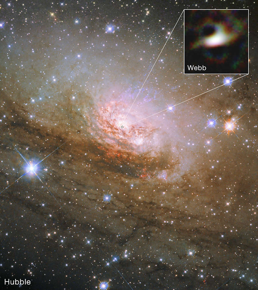 銀河はフレームの中央3分の1を占めている。イメージの周囲には数千の星があり、その中には回折スパイクを持つ星もある。このイメージはハッブルとラベル付けされている。銀河の中心のエリアを輪郭に描いた小さなボックスが右上の四角へと続いている。この「Webb」とラベル付け(小さなボックスの左下)されたイメージには暗く、中央に白く光る楕円形がある。 約1,300万光年離れたシルキナス銀河(Circinus galaxy)には、その進化に影響を与え続けている活動的な超大質量ブラックホールが存在する。ブラックホールに最も近い領域からの赤外線の最大の発生源は、アウトフロー(外側に放出される超高温物質の流れ)と考えられていた。 しかし、ジェームズ・ウェッブ宇宙望遠鏡による新たな観測は、この考えを覆す証拠を提供し、実際には、熱くダストを含んだ物質の大部分が中心のブラックホールに供給していることを示唆している。このデータを収集する手法は、近隣の他のブラックホールの流出および降着成分の解析にも応用できる。 このハッブル宇宙望遠鏡からのイメージは、約1300万光年にある近くの渦巻銀河であるサーキナス銀河(Circinus galaxy)の全体像を示している。インセットでは、銀河の中心部のウェッブからのクローズアップが強調されており、赤外線観測がダストを突き抜けて、中心の超大質量ブラックホールに供給する熱い物質を明らかにしている。ウェッブのイメージは、NIRISS(近赤外画像装置およびスリットレス分光器:Near-Infrared Imager and Slitless Spectrograph)のアパーチャーマスキング干渉計(AMI:Aperture Masking Interferometer)を用いて撮影し、超大質量ブラックホールの周囲に熱いダストを分離し、赤外線の大部分が流出物質ではなく、ブラックホールに供給されるコンパクトでダストの多い構造から来ていることを示している。ウェッブイメージでは、トーラスの内側の面が赤外線で輝き、暗い部分は外側のリングが光を遮っている部分を表している。 この調査には、ウェッブがこれまでに撮影した中で最も鮮明なブラックホール周囲のイメージが含まれている。